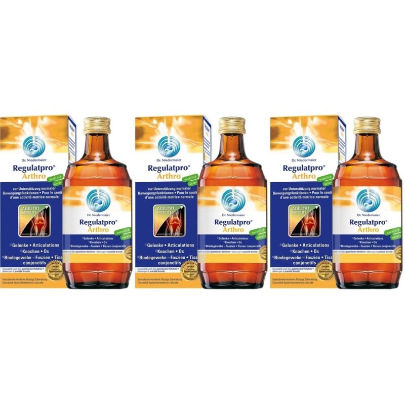 Regulatpro® Arthro je tekutý enzýmový doplnok stravy vyrobený z bio ovocia, zeleniny, orechov a bylín. Obsahuje 50 % kaskádovo fermentovaného koncentrátu REGULATESSENZ® a je obohatený o vitamín C a D3, zinok, meď, selén, kolagén, kyselinu hyalurónovú, glukozamín, dimetylsulfón (MSM) a glukuronolaktón, ktoré vyživujú kĺby, kosti a spojivové tkanivá1.